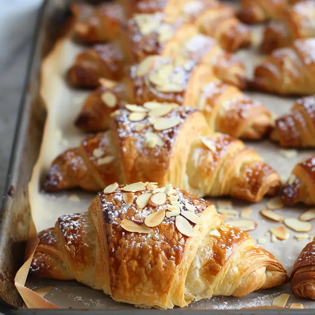 - Schneidet die Croissants auf, füllt sie mit Mandelcreme und streut Mandelblättchen darüber. Backt sie bei 180°C für 10-15 Minuten, bis sie goldbraun sind.